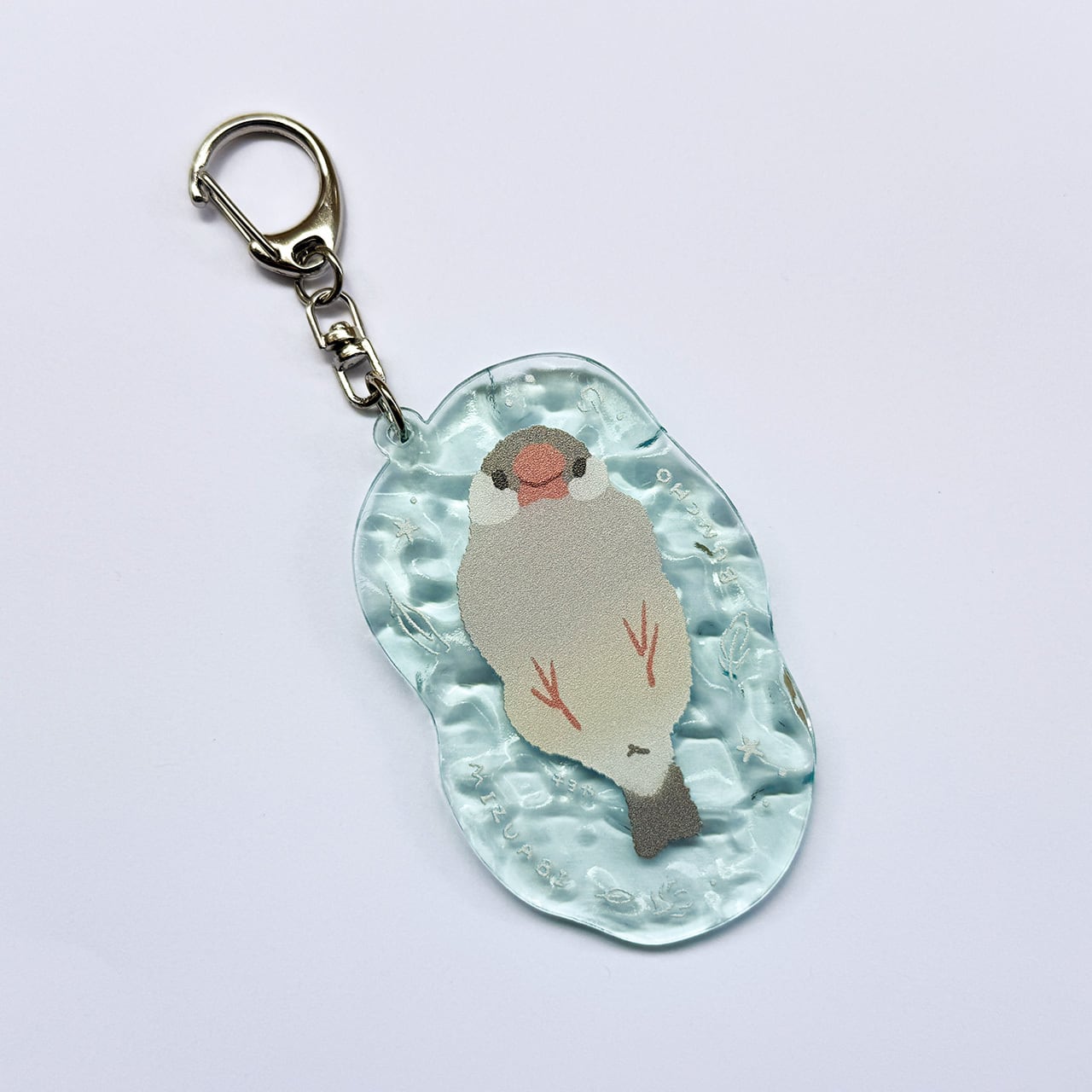水浴びする文鳥をイメージしたアクリルキーホルダー。